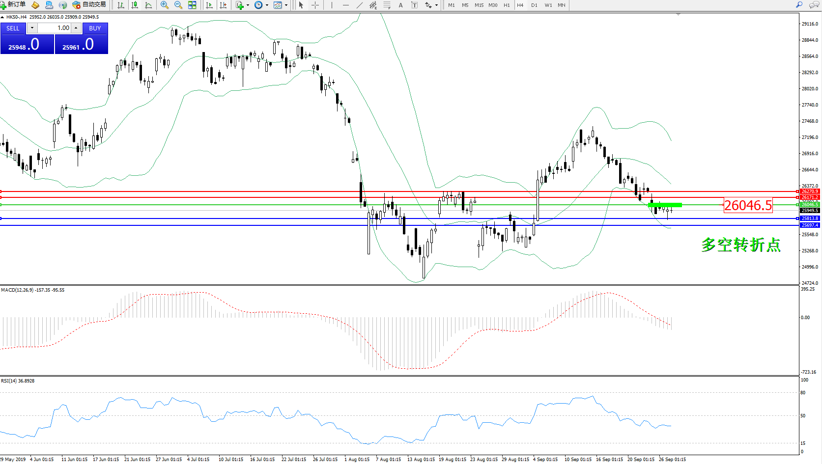 香港恒生指数9月27日(周五)收盘下跌87.12点,跌幅0.33%,报25954.81点;港股上午收升40点,午后持续弱势,曾经小幅倒跌27点。恒指曾连续第跌6日后反弹。而国企指数则连跌8日,累计跌幅超过518点,并创出近4年最长的跌势。市场关注美国总统特朗普受弹劾调查,加上英国脱欧局势仍不容乐观,市场基本面仍弱,贸易谈判消息时好时坏,当下走势仍是下跌行情。