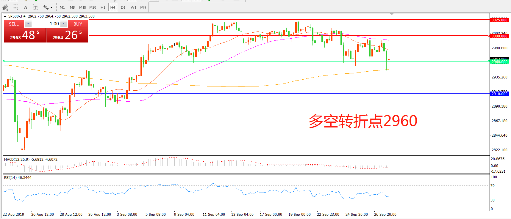 4小时图看,标普500触碰2960支撑后震荡出现反弹,目前维持宽幅震荡走势,均线系统走平,MACD红柱减少,RSI指标拐头向上,日内延续震荡概率较大。