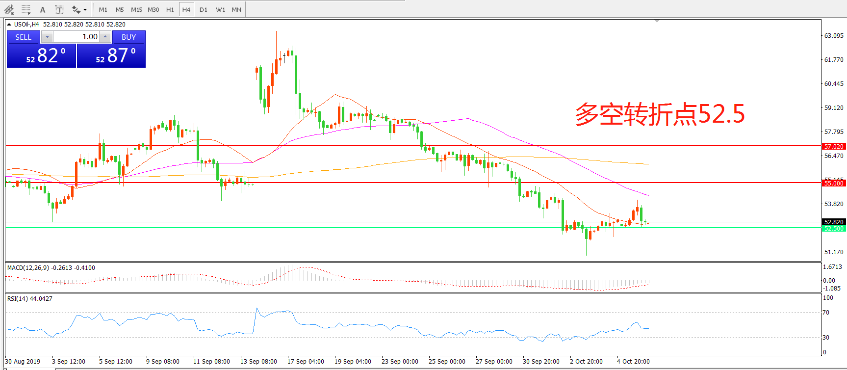 中美将在10月10-10月11日将展开最新一轮贸易磋商,市场交投偏向谨慎,近期一连串疲弱的美国经济数据,包括制造业活动疲弱和服务业成长大幅放缓,加剧了对经济衰退的担忧,市场寄希望于国际贸易谈判取得进展,从而助力油价自上周跌势反弹。美国WTI原油周一(10月7日)冲高后回落,收报52.84美元/桶。