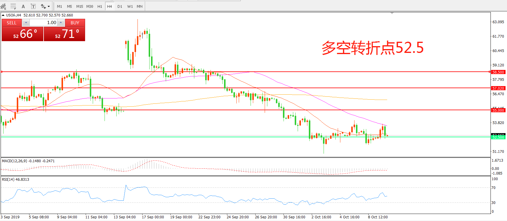 周三(10月9日),北京时间22:30,美国EIA公布的数据显示,美国当周EIA原油库存增加292.70万桶,高于预期的增加171.7万桶,但精炼油库存和汽油库存同步出现减少,这与API库存表现是一致的。成品油库存的减少抵消了原油库存增加的利空,油价呈现窄幅震荡形态, 美国WTI原油最终呈现窄幅震荡,最终收报52.40美元/桶,市场仍在等待中美谈判方面消息的进一步指引。