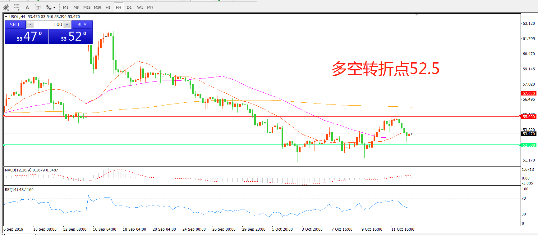 4小时图看,油价触碰55美元一线掉头大跌,显示上方阻力较强,均线系统走平,MACD红柱缩短,RSI指标向上,日内延续上行概率较大。