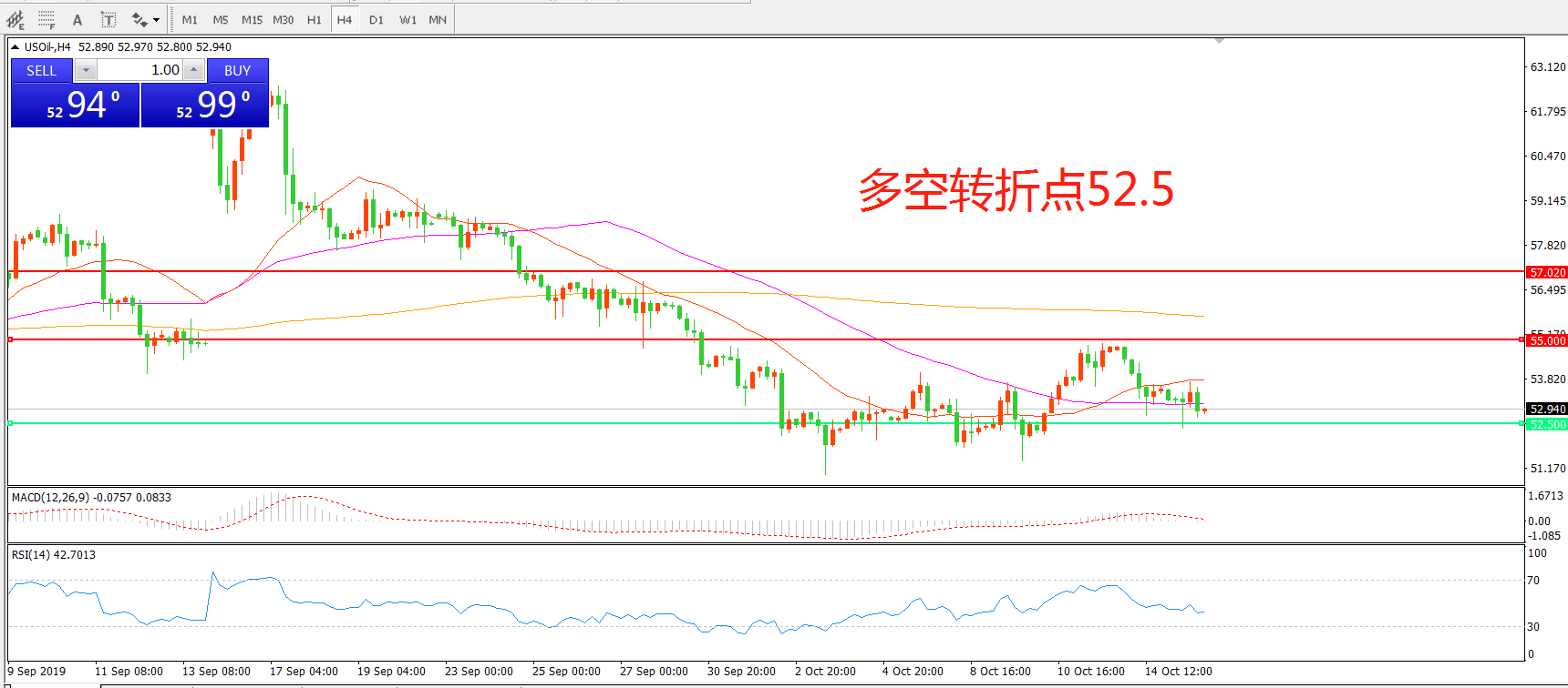 4小时图看,油价延续窄幅震荡,整体走势疲软,均线系统走平,MACD红柱缩短,RSI指标向上,重点关注52.5一线的支撑情况。