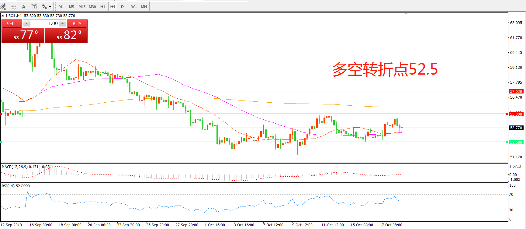 4小时图看,油价延续低位震荡格局,55美元成为上方明显阻力,均线系统粘合形成下方支撑,MACD红柱缩短,RSI指标走平,日内延续震荡概率较大。