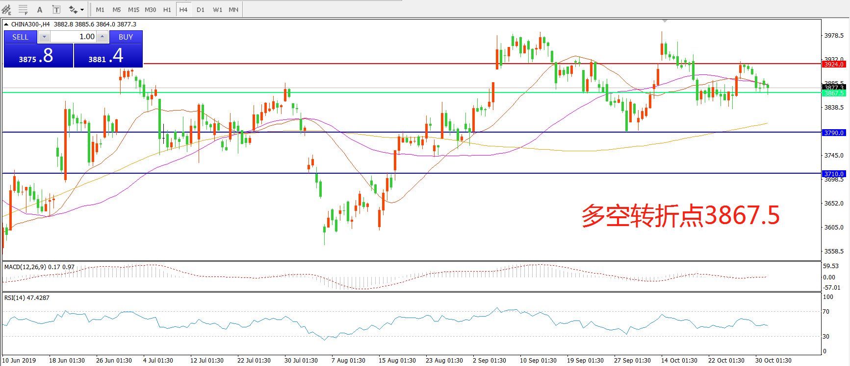 4小时图看,沪深300触碰3924阻力后震荡回落,3867.5成为短期多空分水岭,均线系统走平,MACD红柱缩短,RSI指标向平,日内延续震荡较大。