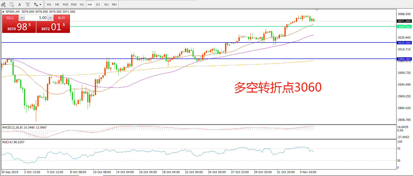 4小时图看,标普500维持高位震荡,整体走势偏强,3060支撑依然存在,均线系统走平,MACD红柱减少,RSI指标向下,日内小幅调整概率较大。