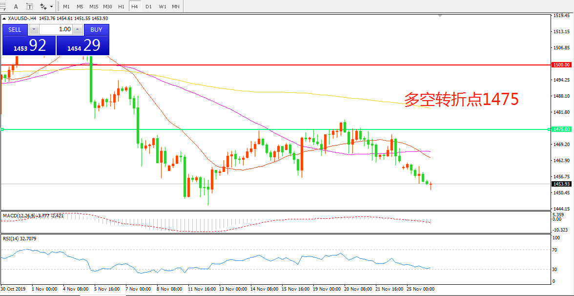 周二(11月26日),美联储主席鲍威尔在普罗维登斯商会的年会上发表讲话称,假如经济保持在当前轨道,那么当前货币政策可能依然适宜。这份措辞与其近期言论形成呼应,鲍威尔讲话后美元保持坚挺,现货黄金价格持续震荡下行,收报1453.80美元/盎司,整体来看,金价承压仍然明显。