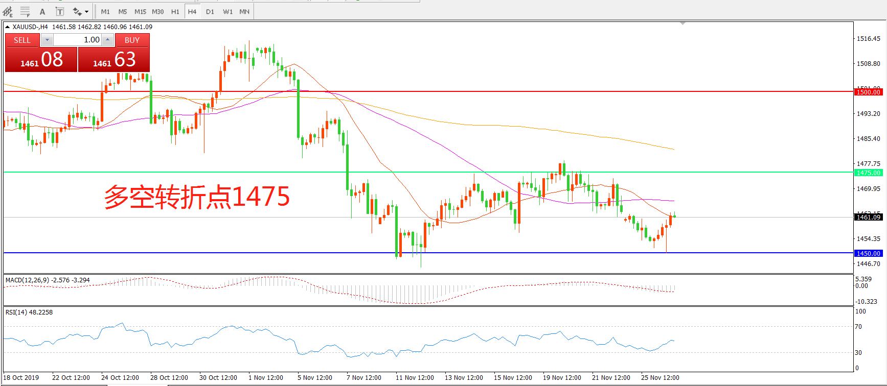 4小时图看,金价呈现宽幅走势,1450成为下方明显支撑,1475成为上方阻力,均线系统逐渐走平,MACD绿柱减少,RSI指标走平,日内延续震荡走势概率较大。