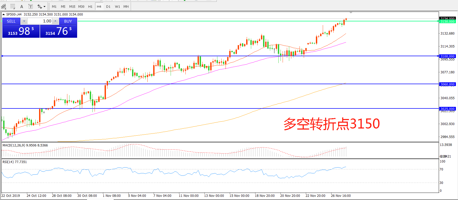 4小时图看,标普500连创新高,多头趋势依然明显,均线系统呈多头排列,MACD红柱增加,RSI指标向上,日内以逢低做多思路为主。