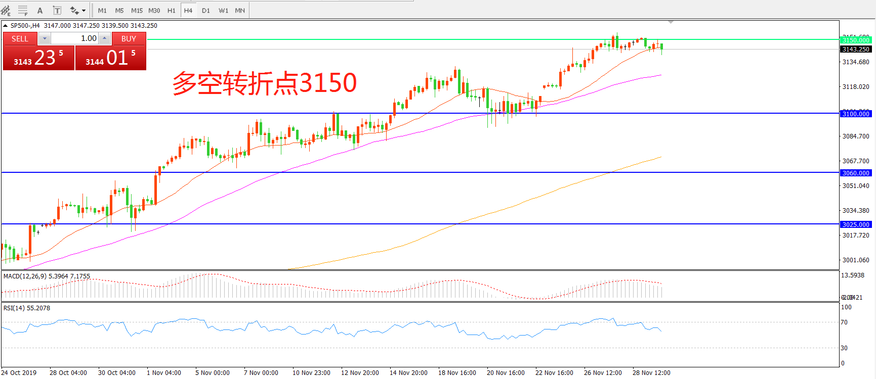 4小时图看,标普500延续高位震荡,整体交投较为清淡,均线系统呈多头排列,MACD红柱减少,RSI指标向下,日内仍以多头思路为主。