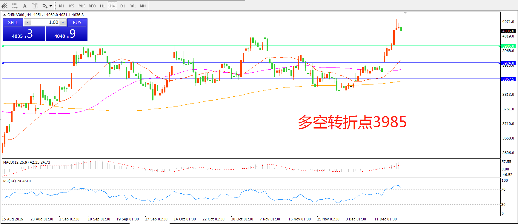 4小时图看,沪深300呈现冲高回落走势,4035附近存在短期阻力,但整体仍处于上行通道之中,均线系统走平,MACD红柱增加,RSI指标向下,日内延续上行概率较大。