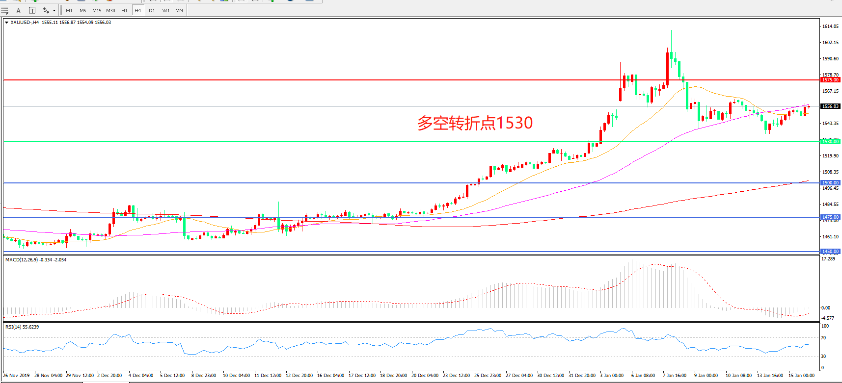 周三(1月15日),中美第一阶段经贸协议签署仪式在美国白宫正式签署,美元指数走低,盘中一度刷新近一周低点至97.15,现货黄金涨近10美元,最终收报1555.19美元/盎司。此外市场还关注俄罗斯政府全体辞职的消息,俄罗斯的突发状况一定程度上会影响金价的走势。
