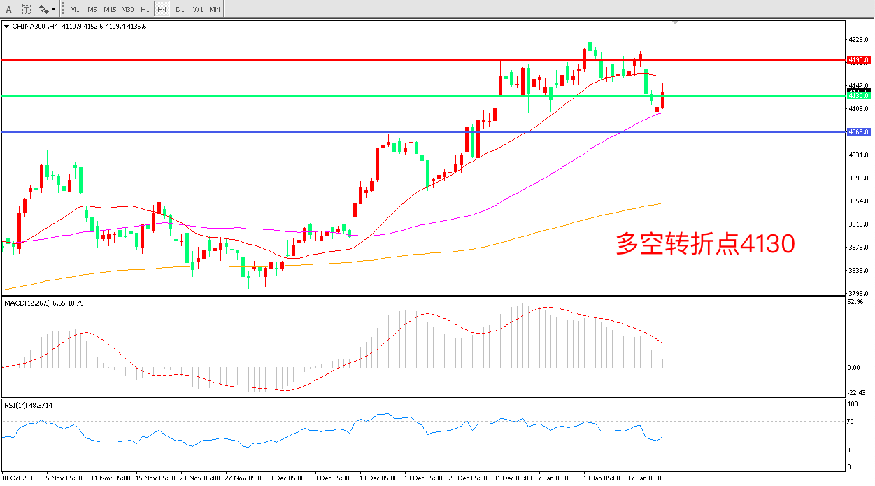 4小时图看, 沪深300长针探底显示下方支撑较强整体走势偏向强势,均线系统呈多头排列,MACD红柱减少,RSI指标走平,日内震荡上行概率较大。