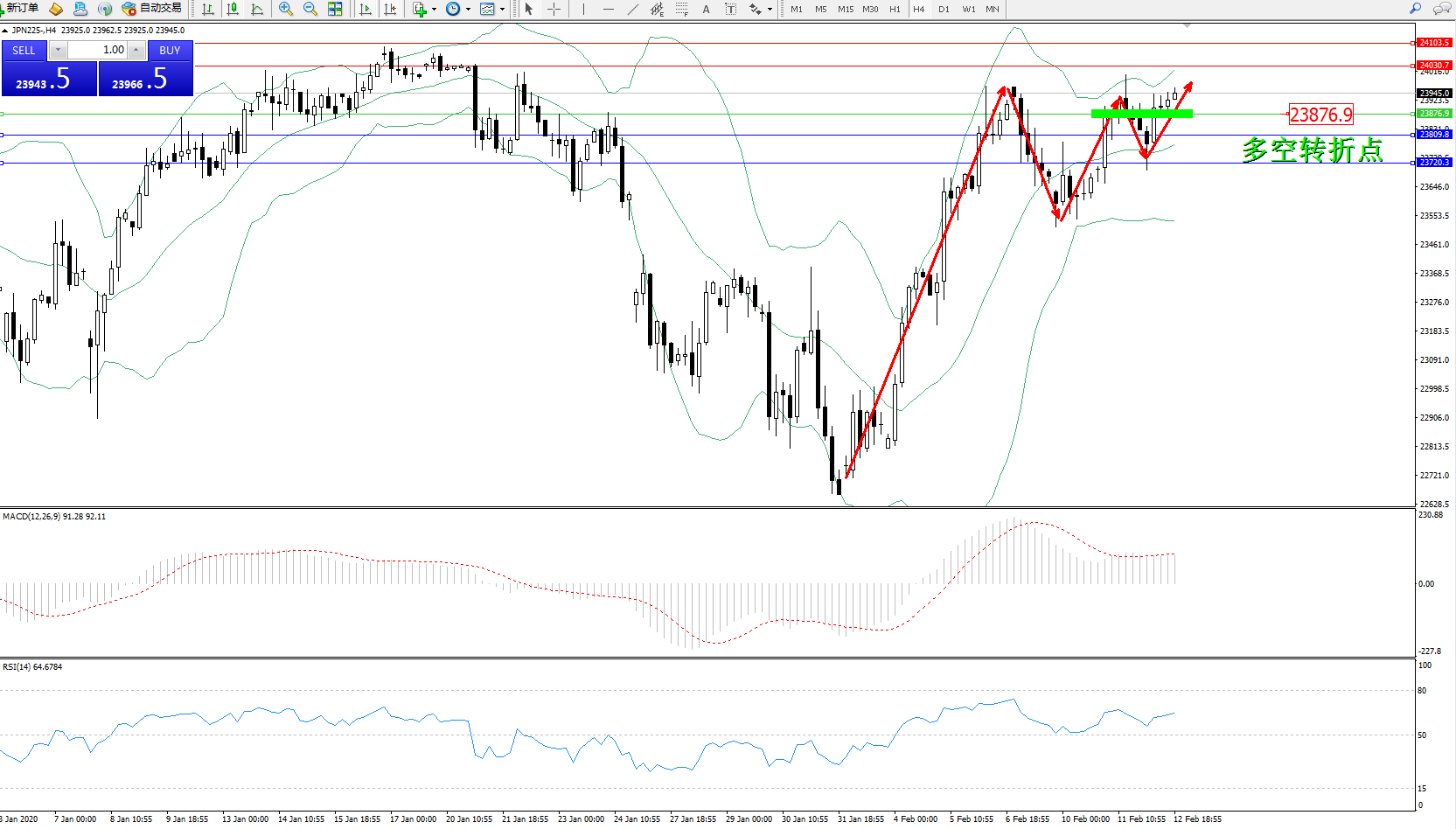 日经225指数212日(周三)收盘上涨173.52点,涨幅0.73%,报23859.50点。虽然日元1月份的机床订单数据不如人意,但是,日本政府在当前会考虑使用财政政策而不是货币政策来提振经济,日本央行再向下调整利率的空间十分有限,亚洲突发公共卫生事件的进展缓解了对全球经济影响的部分担忧,投资者选择风险较高的资产,亚洲股市再度纷纷走高。尽管股市人气乐观,但美国收益率仍在略高于近期低位的地方徘徊,日本出现贸易逆差时通常显现疲软迹象,相对其与美日利差的关系,其与日本贸易数据的关联度更高。