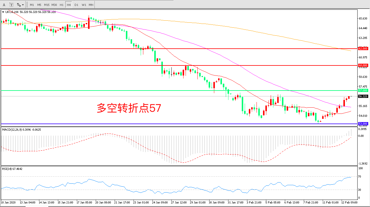 4小时图看,油价探底回升,整体走势有回暖迹象,57美元成为短期阻力,均线系统走平,MACD红柱增加,RSI指标向上,日内延续上行概率较大。