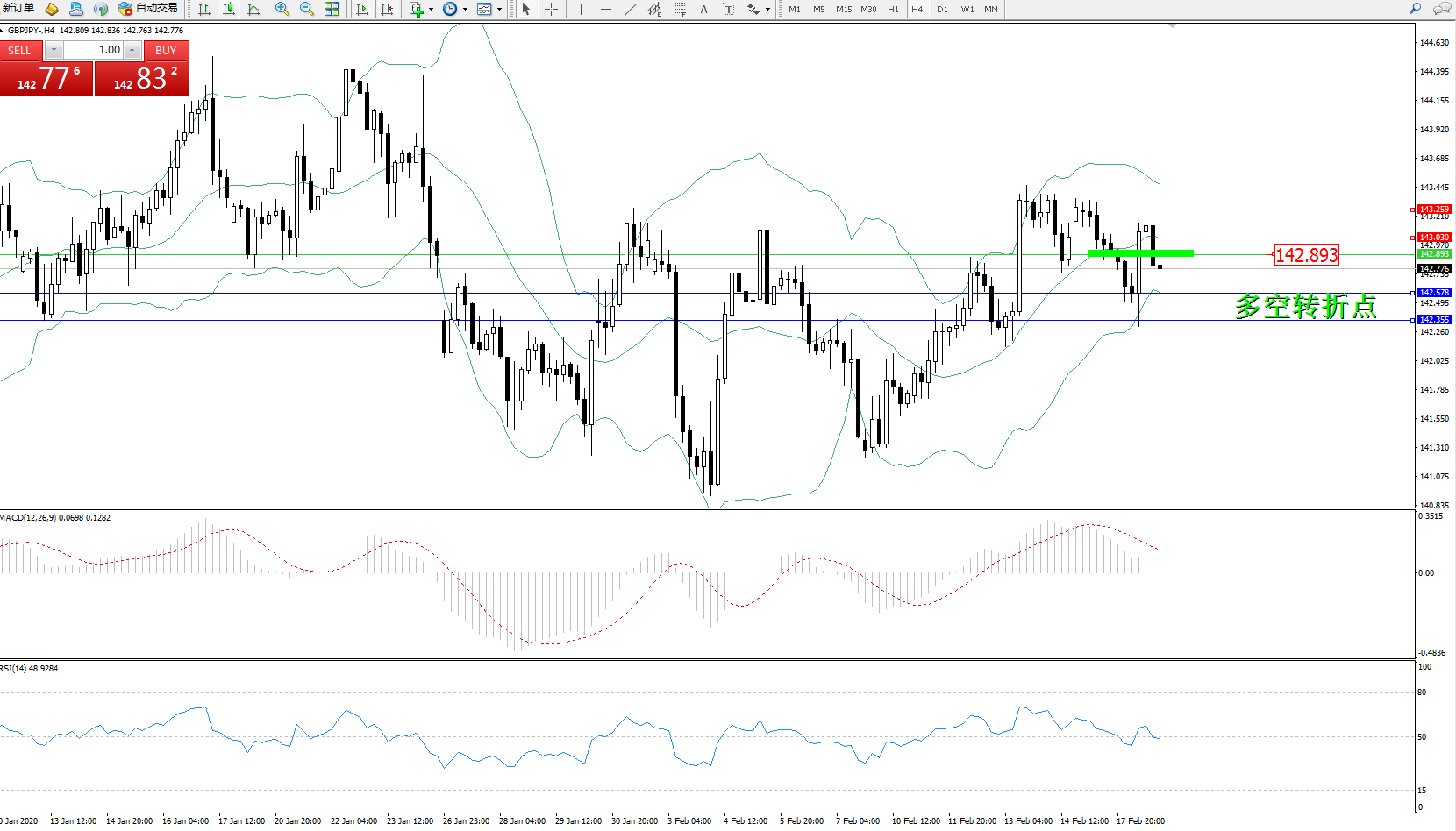 备选策略:142.893上方看涨,目标143.030、143.259