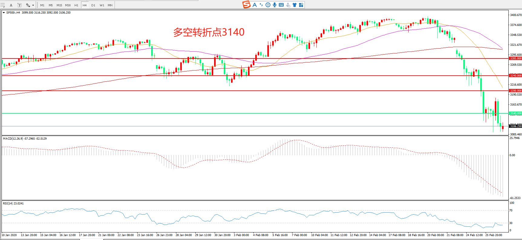 4小时图看,标普500高开低走,整体表现低迷,均线系统呈空头排列,MACD绿柱增加,RSI指标走平,日内延续下行概率较大。