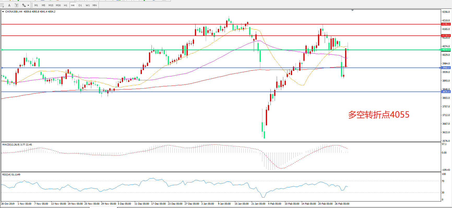 4小时图看,沪深300长阳拉升,整体表现强势,前一日跌幅基本被收复,均线系统走平,MACD红柱减少,RSI指标走平,日内延续震荡概率较大。