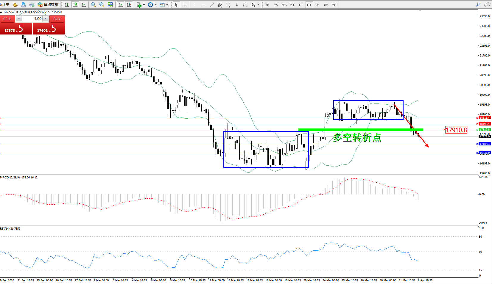 日经225指数4月1日(周三)收盘下跌839.51点,跌幅4.44%,报18077.50点。日本股市周三以大跌走势作为新会计年度的开始,受到新型冠状病毒疫情影响,投资人正为东京可能封城、全球经济衰退、企业获利及派息锐减等因素作准备;日经指数收盘重挫4.5%至一周收盘低点18,065.41点,市场交投冷清,主板成交总值为2.72万亿日圆,创一个月来最低。一些短线客午后抛售股票期货,许多投资人不愿买进,选择观望日本会不会宣布全国进入紧急状态,并在东京实施封锁措施;日本股市的大跌对全球市场情绪拖累明显,美国三大股指期货一度跌逾3%,韩国股市跟跌近4%,欧洲股市普遍下跌,斯托克600指数下跌近3.5%。