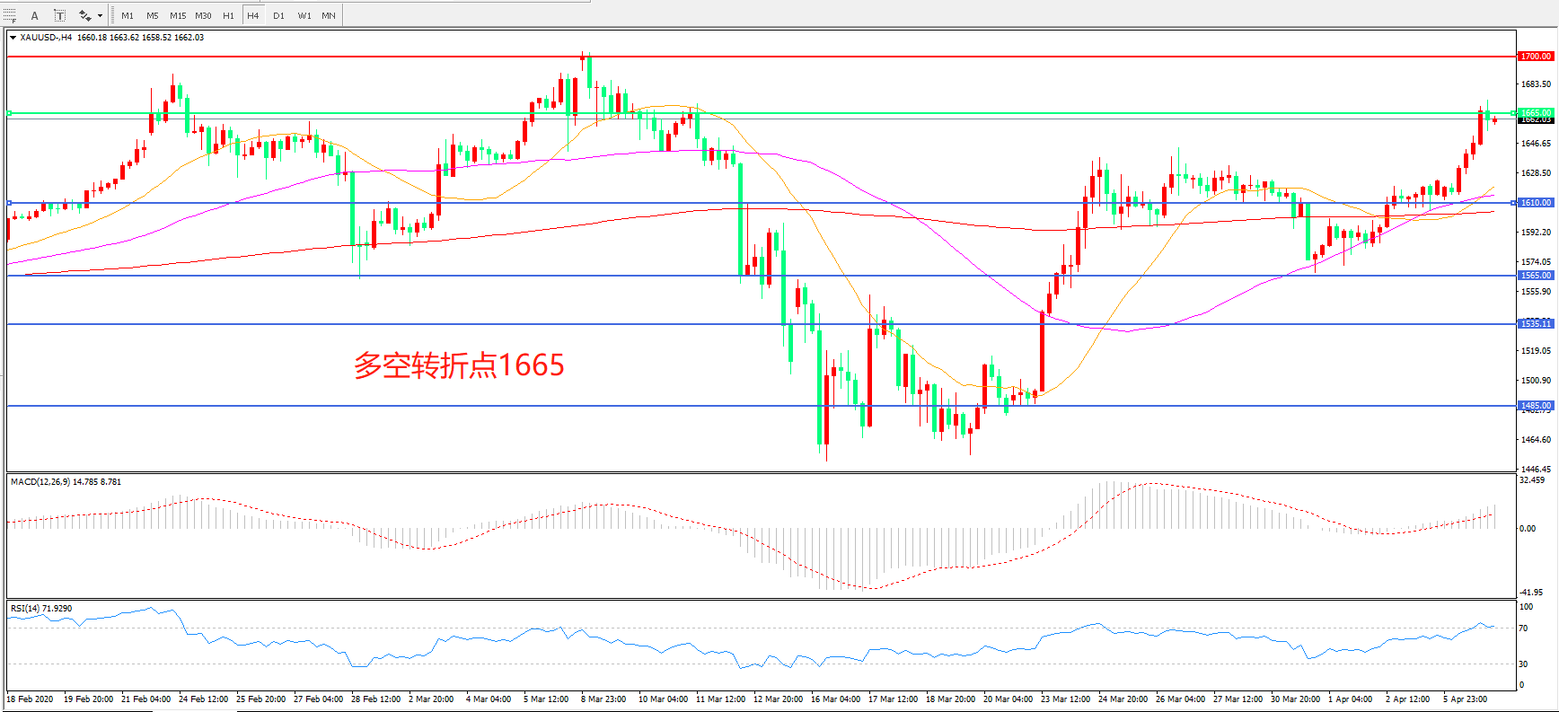 周一(4月6日),由新冠疫情引发的金融危机暂时平静下来,投资者重返黄金市场,现货黄金飙升逾3%,收报1663.17美元/盎司,创下至三周多以来的高点。此前美股大幅下挫,投资者不得不抛售一切可以抛售的商品,以换取保证金,如今股市回升,那么黄金被抛售的力度就会减弱,从而短线支撑金价。