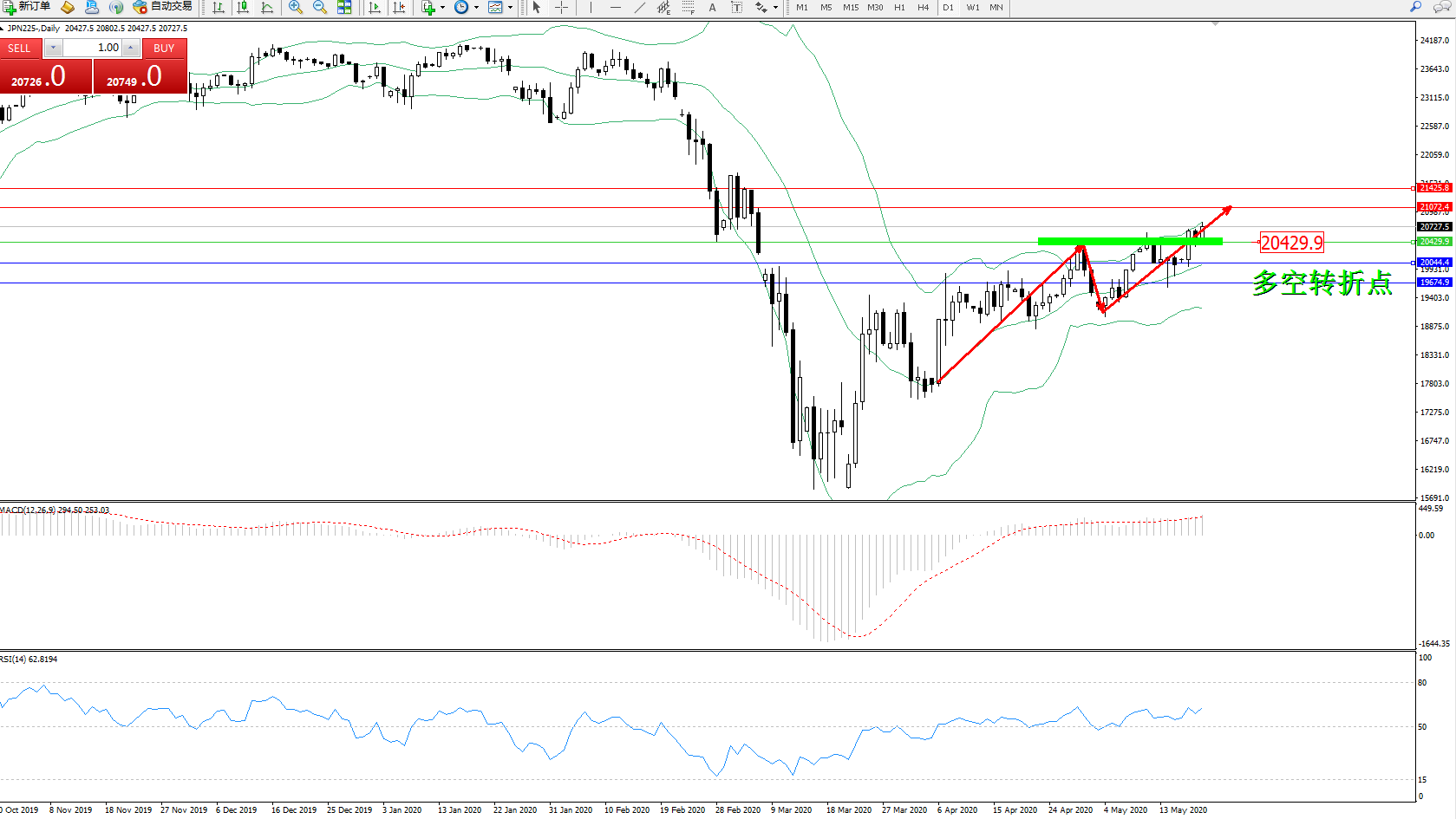 日经225指数5月20日(周三)收盘上涨165.55点,涨幅0.81%,报20599.00点。日本3月核心机械订单下滑,表明新冠疫情对经济的冲击不断扩大,尽管大量高价商品订单缓解了下滑速度。3月订单小幅下降可能导致本季投资崩跌,4月国内机械工具订单重挫,说明上个月核心机械订单大幅下滑;日本工具机械工业会(MTBA)上周发布的初步预估显示,日本4月机械工具订单降至逾10年来最低水平。5月日本企业信心下滑态势加剧,降至十年来的最低点,因为企业为新冠病毒疫情导致的长期经济疲软做好准备。日本央行将于周五召开紧急政策会议,将为金融机构设立一套奖励机制,以鼓励他们向受到新冠疫情打击的小企业增加放贷;投资者需要予以关注。