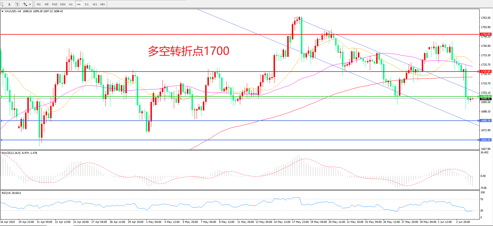 周三(6月4日),有”小非农”之称的ADP就业人数公布,减少276万的数据大幅好于预期,风险的情绪引发投资者对黄金的进一步抛售,现货黄金较日高回落逾40美元,收报1698.61美元/盎司。短期内金价可能进一步走软,如果能回撤到1680美元水平,这将是投资者逢低买入的机会