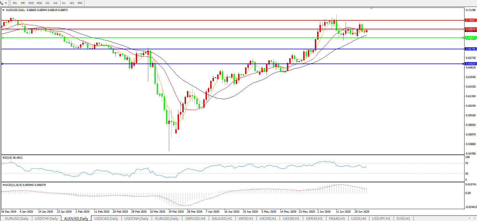 澳元兑美元在周五亚洲时段延续周四全天的窄幅震荡走势,亚洲多地休市的状况限制了市场交投活跃性,同时市场情绪继续受到全球疫情前景不确定性的影响,这使得澳元兑美元汇价始终受制于0.69关口阻力,而这也是之前一个交易日内始终无法收复的200小时均线关口。由于美国等地新发感染人数继续维持于高位水平,投资者仍被迫在周末前继续兑日美元避险,这意味着澳元汇价在日内有大概率将继续承压