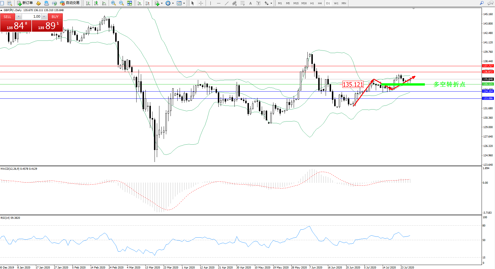 交易策略:135.121上方看涨,目标136.872、137.727