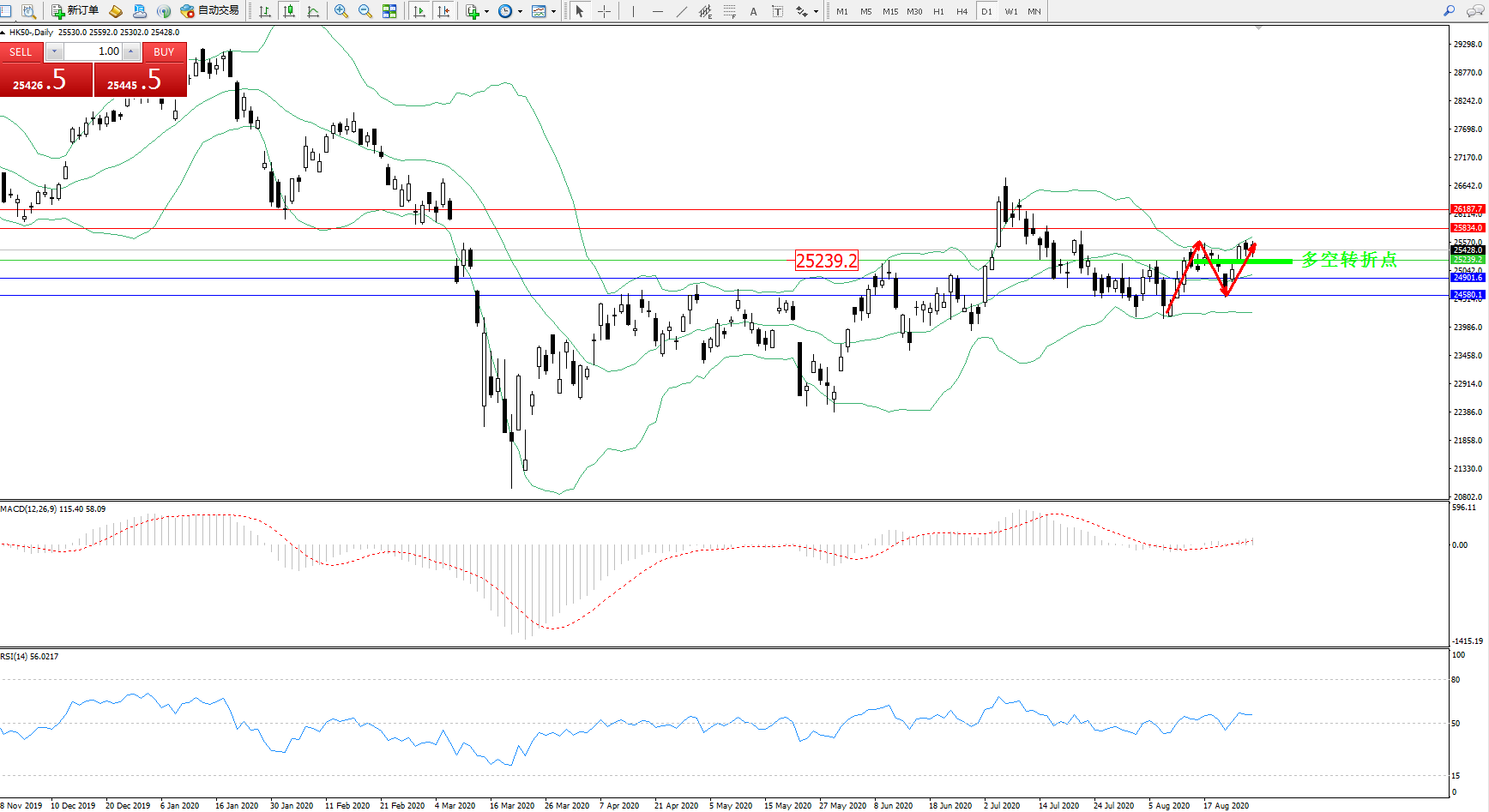 香港恒生指数8月26日(周三)收盘上涨5.57点,涨幅0.02%,报25491.79点;港股三大指数呈震荡走势,恒指全日振幅不超1%,在线教育股、乳制品涨幅靠前,蒙牛乳业升3%;手游股延续强势,网易涨超4%冲击新高;大型科技股表现亮眼,京东、阿里齐创新高,分别涨6%和4%,小米亦涨近6%。今日南下资金净流入24.86亿港元,大市成交额为1332亿港元。香港特区政府卫生署卫生防护中心介绍,截至26日0时,香港新增24例新冠肺炎确诊病例,累计报告确诊病例4734例。新增确诊病例全部都是本土确诊病例,其中有10例暂未确定感染源头。截至25日,香港新冠肺炎疫情累计造成78人死亡。