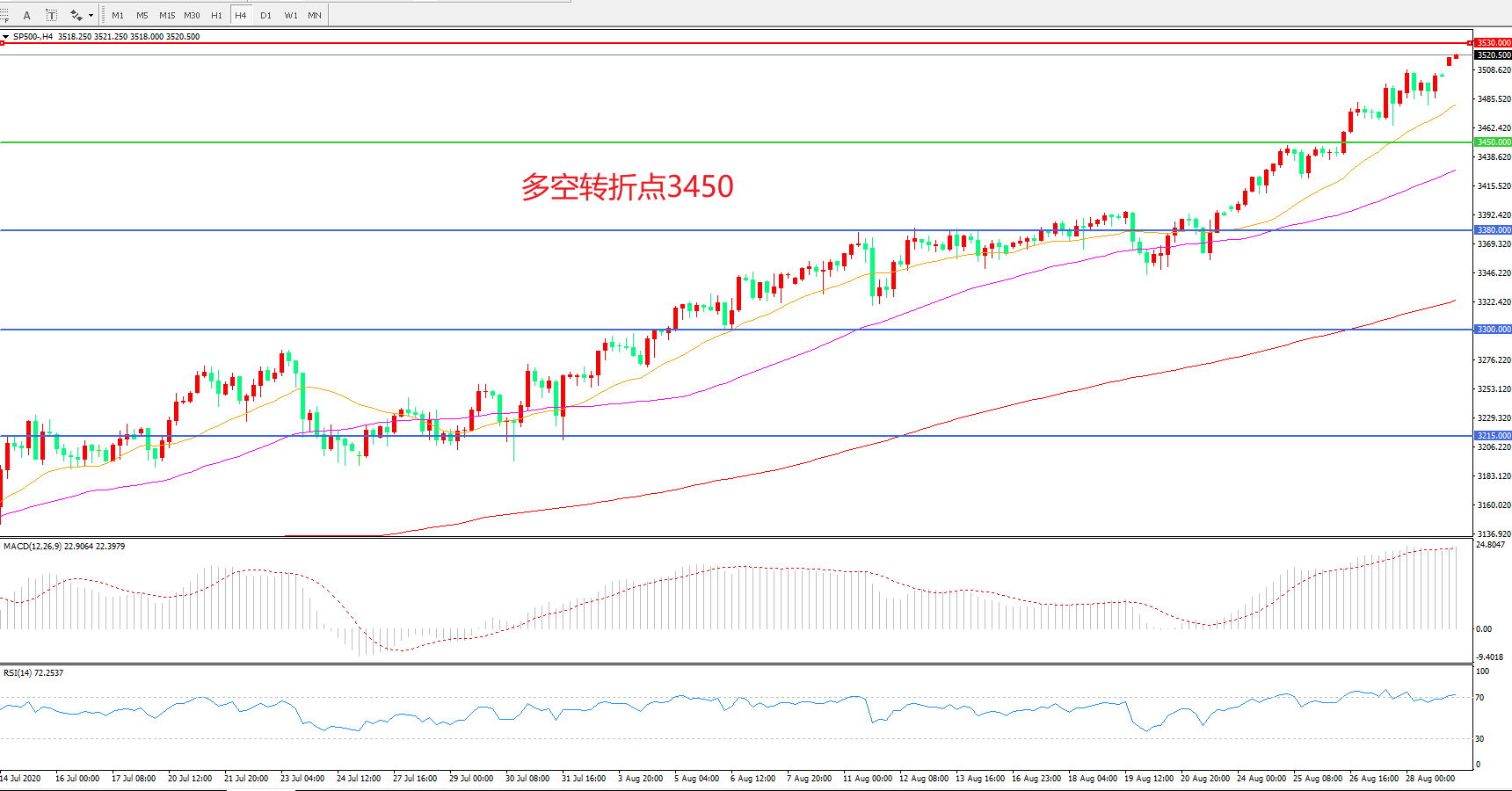 上周,鲍威尔在讲话中宣布政策框架进行的最大调整,美联储自此开启低利率时代,标普500受到提振,震荡上行后收报3503.75点,再度刷新历史新高,较3月底的最低点涨幅高达60%。美国总统特朗普表示,新型冠状病毒疫苗可能在11月3日总统大选前上市,这样的利好鼓舞了市场信心。