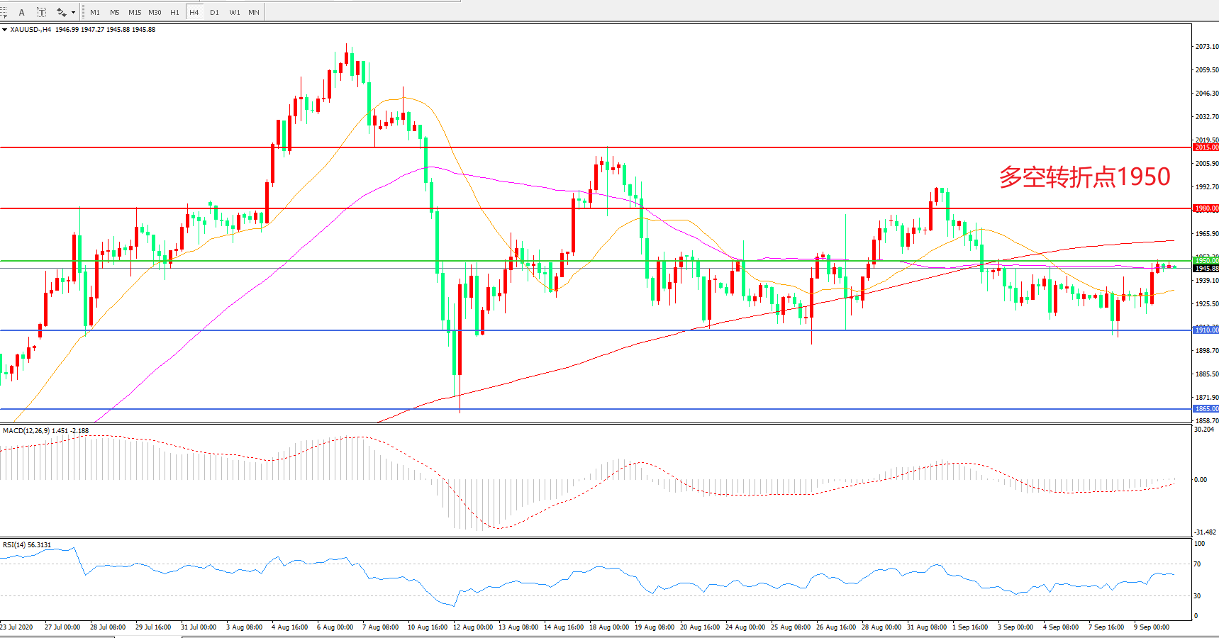 4小时图看,金价回踩1910震荡反弹,区间震荡走势较为明显,1950成为短期阻力,均线系统走平,MACD红柱增加,RSI指标走平,日内延续震荡概率较大。