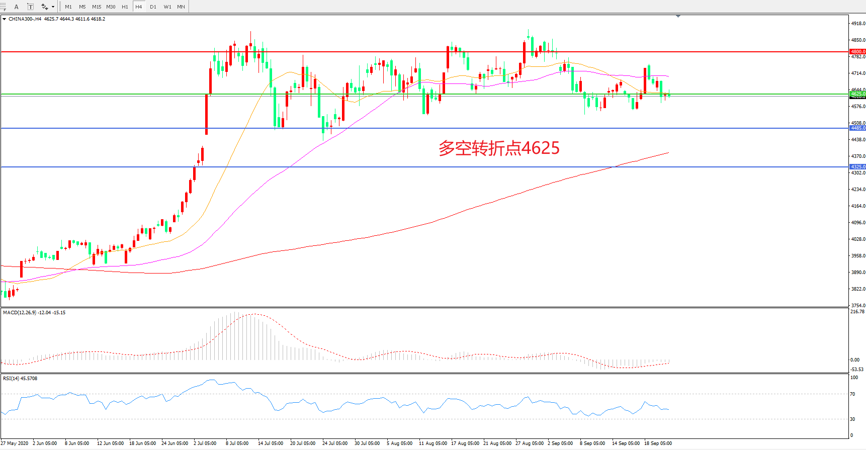 4小时图看,沪深300冲高回落,短期涨势受阻,4625成为多空争夺焦点,均线系统走平, MACD绿柱缩短,RSI指标向下,日内延续震荡概率较大。