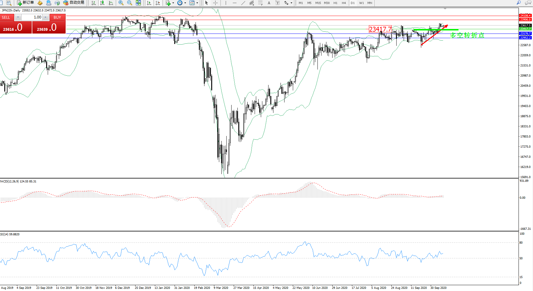 日经225指数10月12日(周一)收盘下跌68.69点,跌幅0.29%,报23551.00点。美国两党继续财政刺激谈判。尽管美国国会在总统大选前通过财政刺激法案的可能性很低,但市场仍在关注其进展。目前美国的抗疫纾困财政刺激计划仍陷入混乱,两党在新方案方面仍未达成共识。日本央行专注于企业融资和市场稳定,如有必要将毫不犹豫采取行动,日本央行的态度是开放且灵活的,日本央行的疫情应对措施已经产生了积极的影响,将在必要时采取更多的措施,消费者在服务业的支出可能保持疲软.日本通胀率将在2021年转为正值,近期通胀率将为负值,新冠肺炎抑制了消费需求,我们预计未来几年通胀将逐步上升。