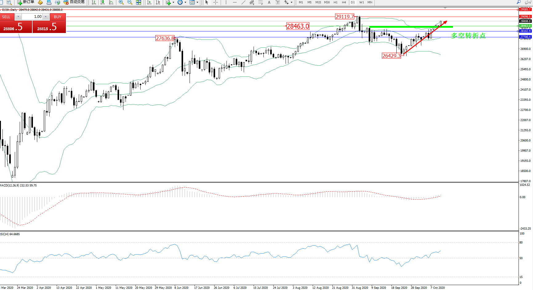 技术点评:多头动力延续布林带指标上轨内侧持续震荡上扬态势良好,布林带指标呈张口走势持续中,且有突破前期高位29119位置态势,多头动力拉升强悍,MACD指标多头动力突破0轴线后维持上移中RSI指标低位多头动力上移至多头区域持续拉升上扬徘徊中;