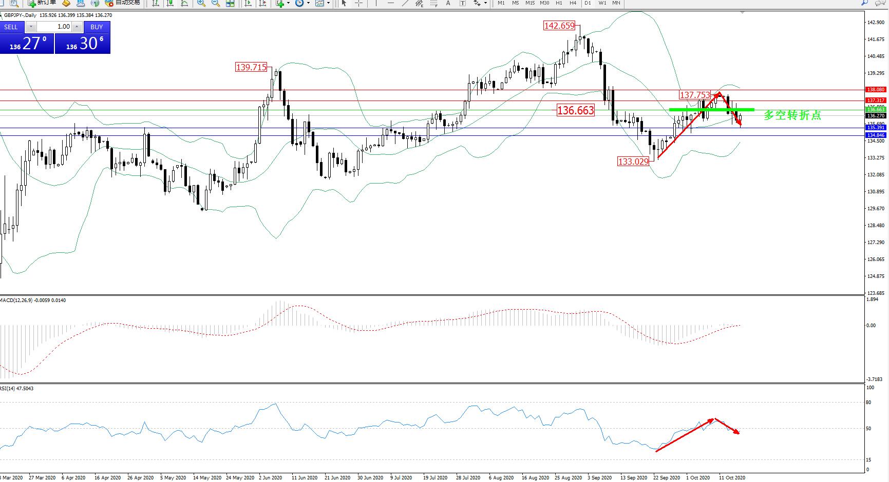 技术点评:低位多头动力持续震荡上扬至137.753位置附近后遇阻,开始震荡回撤,处于中上轨区间高位下行,纠结于中轨附近持续徘徊中,有继续向下移动态势,布林带指标呈收口走势中,MACD指标处于空头区域低位整理回升至0轴线附近弱势徘徊中,RSI指标低位多头动力整理回升至50均衡线后持续震荡后有回撤下行迹象;