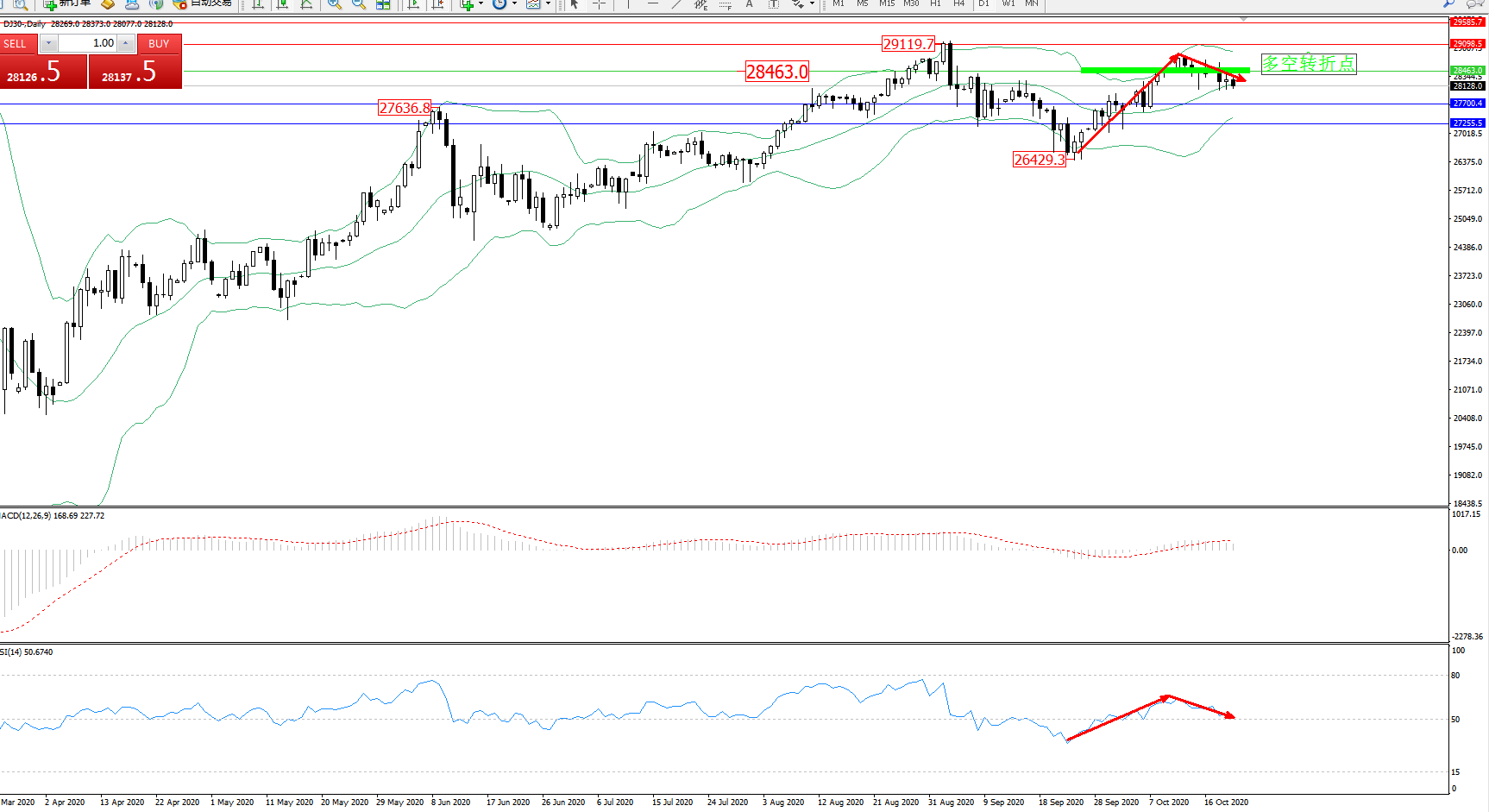 道琼斯指数10月21日(周三)收盘下跌98.00点,跌幅0.35%,报28210.82点。美国参议院周三(21日)未能通过5000亿美元的新冠病毒救助刺激计划法案,救济谈判已经拖延至离选举日不到两周。据悉,该法案将使联邦政府提高每周的失业救济金,向学校拨款1000亿美元,并为测试和疫苗开发分配资金。但因51票对44票未能达到使立法向前推进所需的60票,法案未能通过。几乎所有民主党人都对该法案表示反对,他们担心美国将没有足够的资金来对抗新冠病毒和帮助更多美国人,于是呈现出“要么全有,要么全无”的结果。美国众议院议长佩洛西称,有可能与美国财长努钦就应对新冠疫情冲击的刺激方案达成协议,但可能无法赶在11月3日前让国会两院通过。然而,如果达成协议,仍然会在参议院面临阻碍,美国参议院多数党领袖麦康奈尔已警告白宫,不要同意任何类似于佩洛西所支持的全面方案。