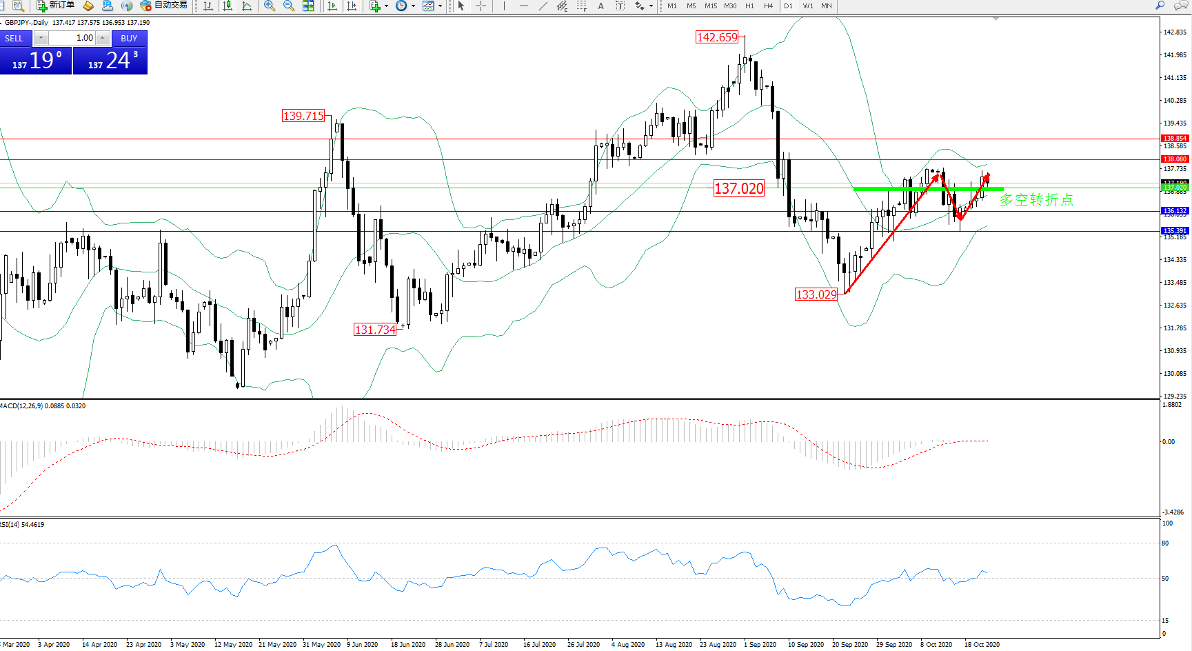 英镑兑日圆137.177附近弱势震荡由于美国选情开始白热化,面对之后可能出现的计票风波和僵局,投资者选择未雨绸缪有序提前撤离美国市场,脱欧谈判进程传出重大利多,欧盟方面官员亲口承认距离达成最终协议仅有“一步之遥”,这令投资者情绪全面乐观,这同时叠加上美国选情风险引发的资金外逃导致的美元跌势一同,推动镑系扶摇直上走高;盟谈判代表称与英国的协议触手可及,进一步提升市场对脱欧协商的乐观预期,此外市场对美国有望在大选前出台财政刺激方案的乐观期望,推升风险资产,英国财政大臣苏纳克:我们的经济正面临巨大的压力,更多的人将失去工作。