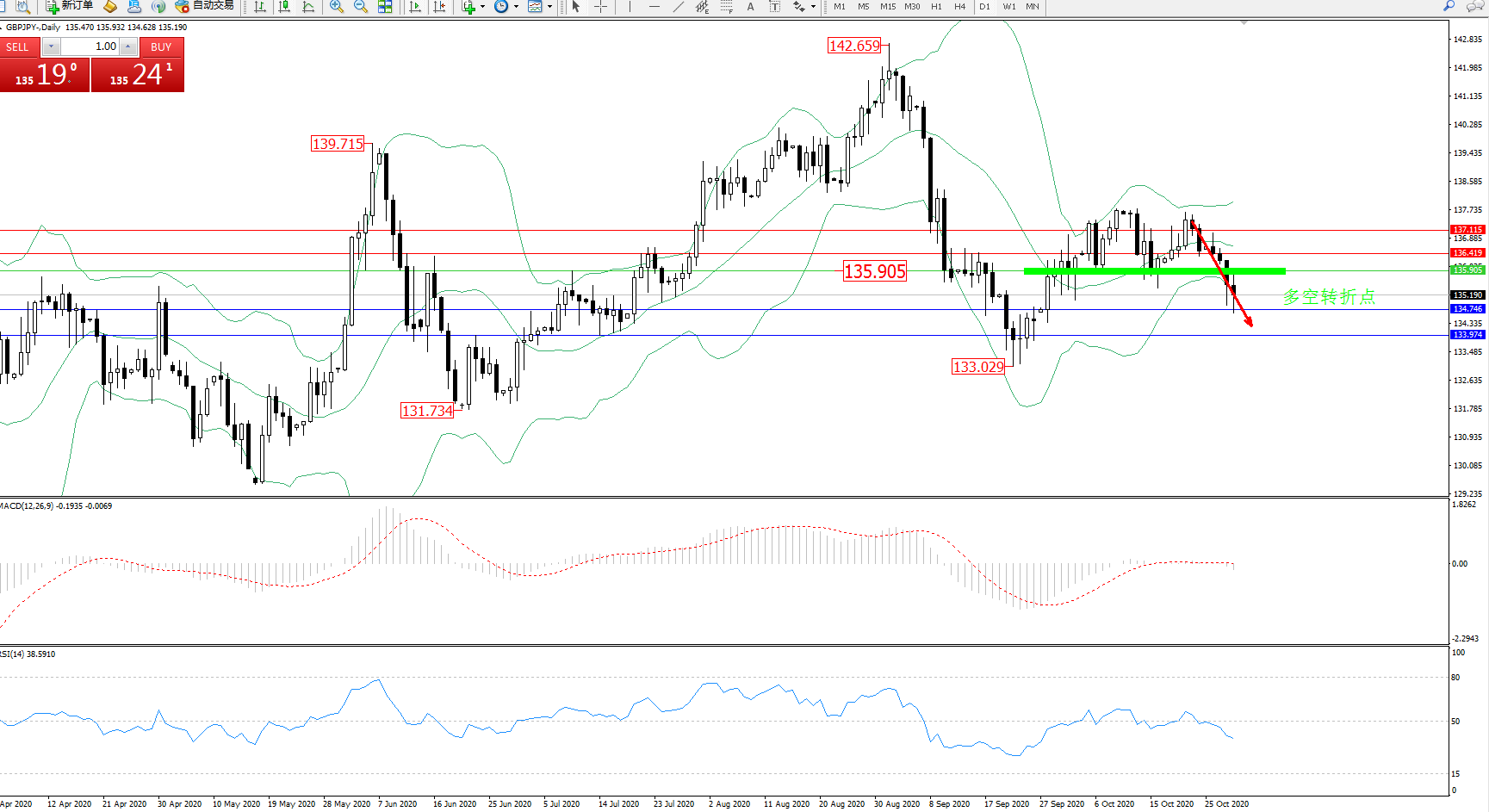 英镑兑日圆持续下行至135.216附近,英国央行决策者将会在11月5日的会议上决定增加资产购买规模并将在明年6月结束该计划;货币政策委员会将确认,如果前景允许,它随时准备进一步放松政策,包括将利率下调至零以下;预计英国央行会下调今明两年的经济增长预期并上调2020年通胀预期。欧洲疫情恶化提升了避险美元,同时英国各地也准备采取地区性封锁,但不会采取全球性封锁行动,如果英国脱欧协议能够在年底前顺利达成,那么配合上美元指数在美国政局前景微妙,财政援助协议仍然充满变数,迫使美联储在年底再度出面“救火”的这一前景。