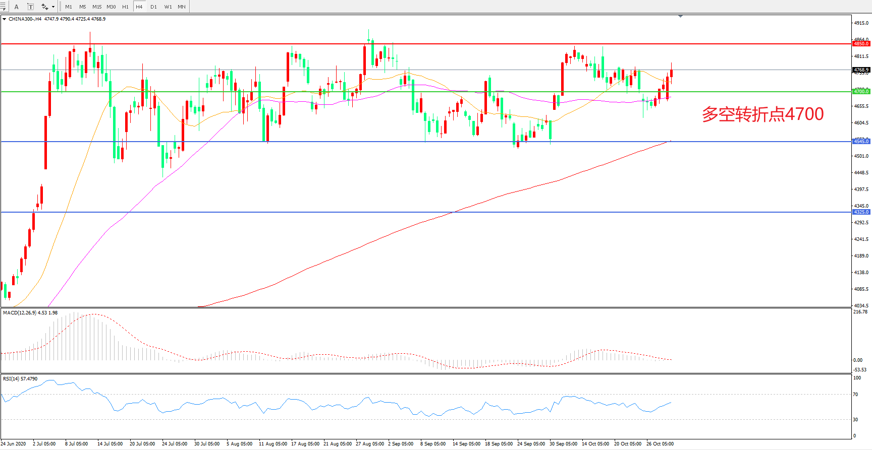 4小时图看,沪深300以55周期均线为依托震荡上行,整体表现有所回暖,下一阶段有冲高触碰箱体上沿的可能,MACD红柱缩短,RSI指标向上,日内延续震荡概率较大。