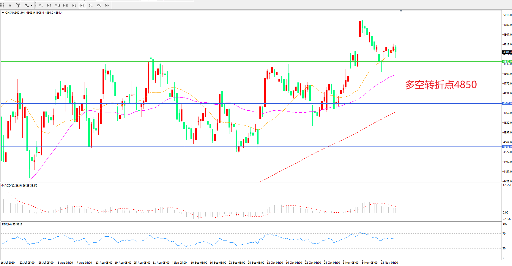 4小时图看,沪深300延续高位震荡,短期走势相对波折,21周期均线成为支撑,MACD红柱缩短,RSI指标向上,日内延续震荡概率较大。