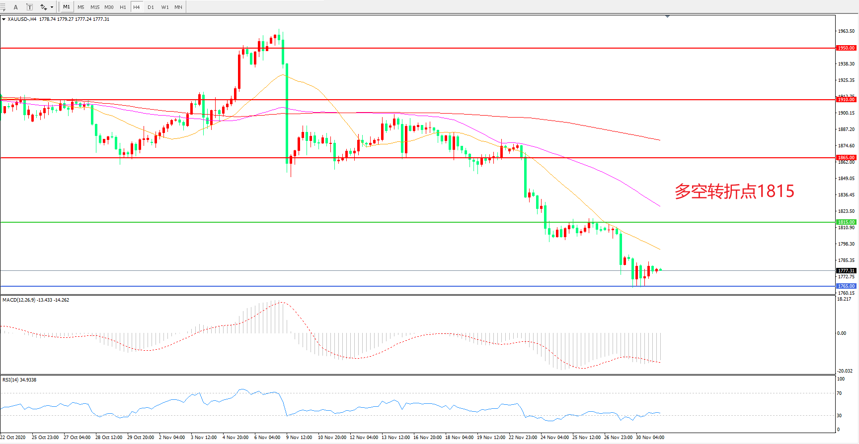 周一(11月30日),美元指数从逾两年半低点反弹企稳,市场风险情绪有所回落,金价延续低位震荡,收报1778.17美元/盎司。由于美联储奉行极为宽松的货币政策,美债利率大体将维持在较低位置,而美元有较强的贬值预期,所以在市场逐步消化疫苗的影响之后,基本面仍将为黄金筑底时提供一定支撑。