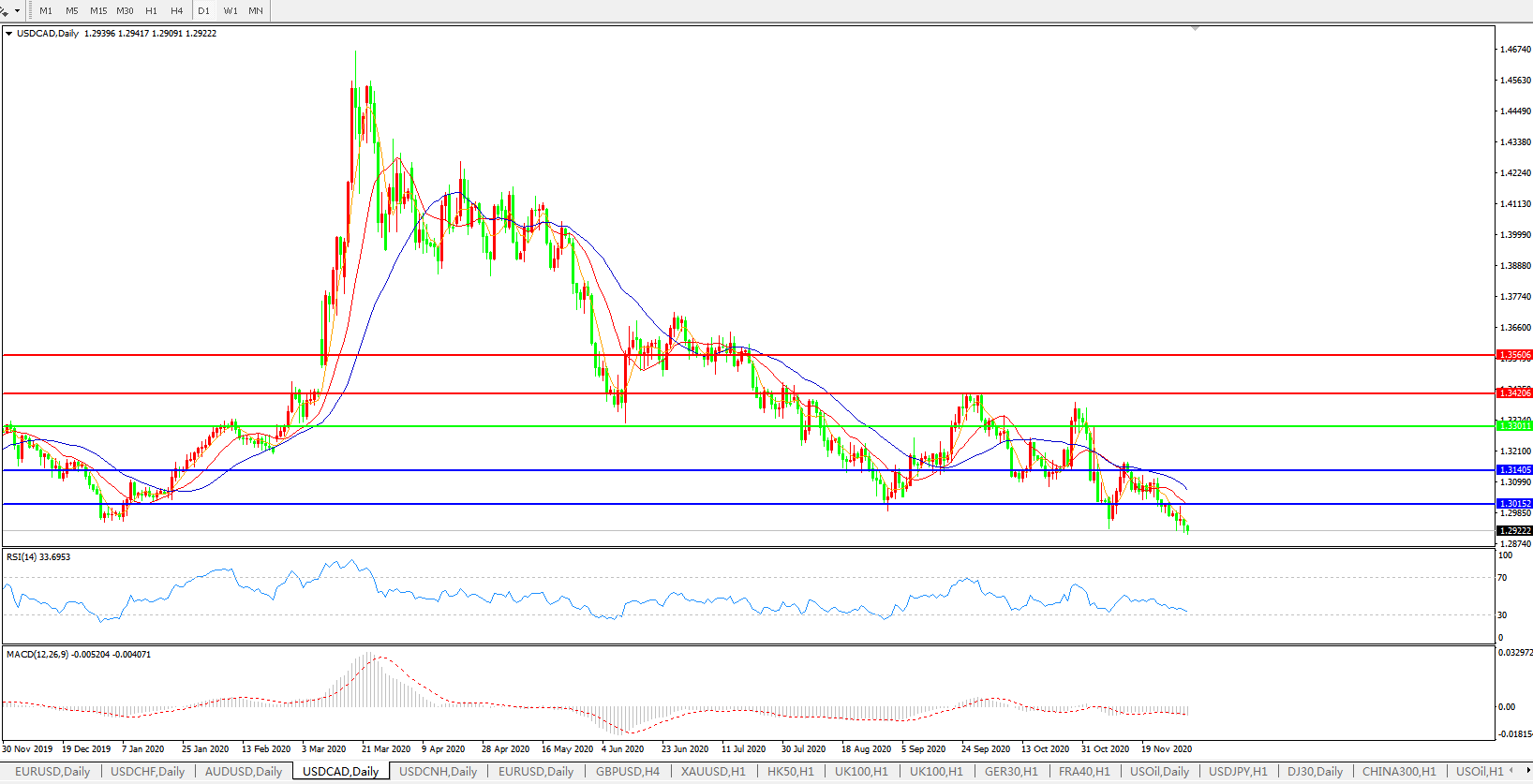 美元兑加元在周三日内陷入低位震荡走势,在一度跌触1.2916这一自2018年10月以来的逾两年低位后略有反弹,因国际原油价格前景在OPEC部长会议仍未结束之际的纠结走势暂时限制了产油国货币加元的进一步上行空间; 但分析师指出,如果OPEC决议之后尘埃落定,决定将继续延长现有减产力度至2021年二季度以后,那么油价有望录得进一波上行,这一旦叠加上美国政治僵局和财政谈判继续无果的状况,料将推动加元汇价相对美元继续升值,在此状况下,美元兑加元终将跌破1.29关口,之后的进一步支撑位将下看至1.2783