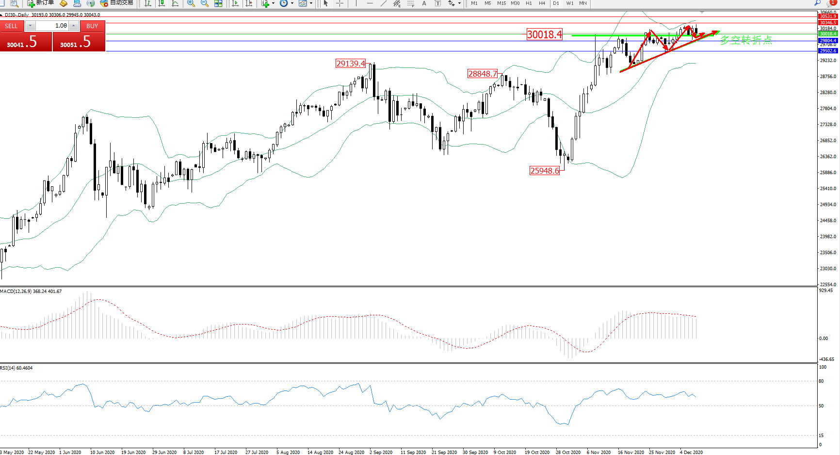 道琼斯指数12月9日(周三)收盘下跌105.10点,跌幅0.35%,报30068.81点。美股三大指数集体下跌,道指初步收跌约110点,抗疫概念股、太阳能板块走低,随着疫情迅速发展至超过危机早期的水平,美国立法者试图就新的财政支持计划达成协议;投资者目前正在等待美联储下周为期两天的会议的政策线索。美国参议院多数党(共和党)领袖麦康奈尔表示,民主党人在周二“抛弃了”共和党的新冠援助提议,在援助方案上继续朝三暮四。他表示,民主党人对他在此轮援助法案中搁置州援助和责任保护的提议“泼冷水”,又拒绝美国财长努钦提出的9160亿美元的提案。麦康奈尔表示,很多有助益的政策双方都同意,但除非民主党人确定他们真的想制定一项法案,否则将无能为力。