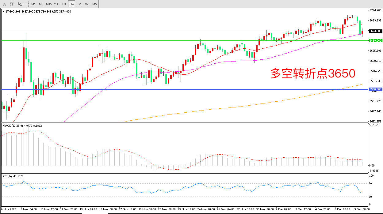 4小时图看,标普500高位长阴下破短期涨势遭受重挫均线系统呈多头排列55周期均线成为下方支撑 MACD红柱减少RSI指标走平,日内延续上行概率较大