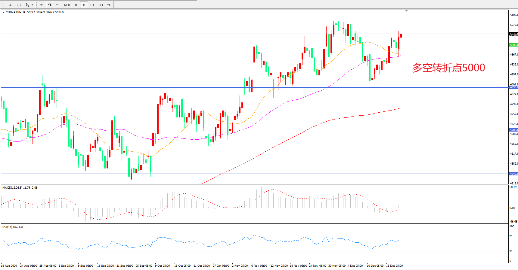 4小时图看,沪深300回踩55均线支撑后大幅拉升,短期表现强势,5080附近仍是中期阻力,MACD红柱增加,RSI指标向上,日内震荡上行概率较大。