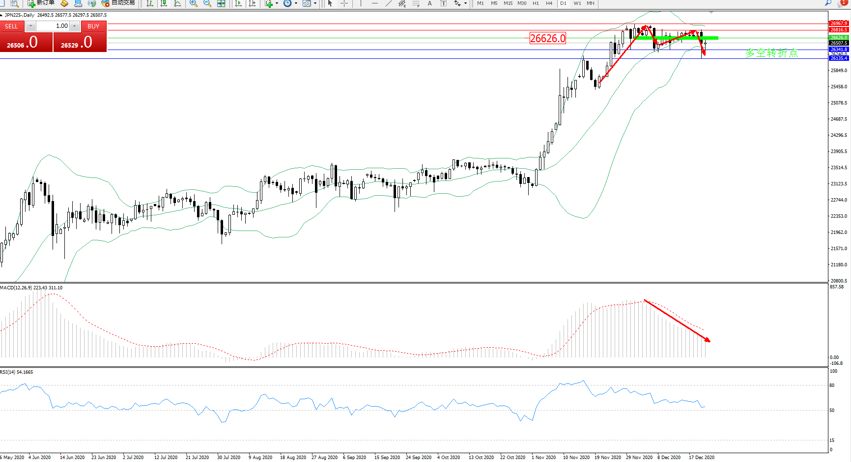 日经225指数12月22日(周二)收盘下跌305.42点,跌幅1.14%,报26409.00点。日本政府:在12月经济报告中保持总体经济预期不变。由于新冠病毒,日本经济形势严峻,但已出现好转迹象。提高了对出口、产出、企业利润和破产的评估。3个月来首次下调对民间消费的预期。整体经济形势仍然“严峻”。日本《产经新闻》12月22日报道,海上自卫队一号和二号人物——海上幕僚长山村浩与海上幕僚副长西成人同时感染新冠病毒。产经援引海自广报室消息称,两人目前均无症状。21日在东京都内的医院接受核酸检测,22日确认结果为阳性。朝日电视台透露:除此以外,辅助陆幕、海幕和空幕幕僚长的副官也各自感染。防卫省正在调查感染路径,确认是否属于聚集性传染。日本东京日新增563例新冠肺炎确诊病例。日本兵库县新增190例新冠肺炎确诊病例。日本计划将针对新冠疫情的商业补偿措施纳入法律。日本修订法律将赋予地方政府更多自治权。