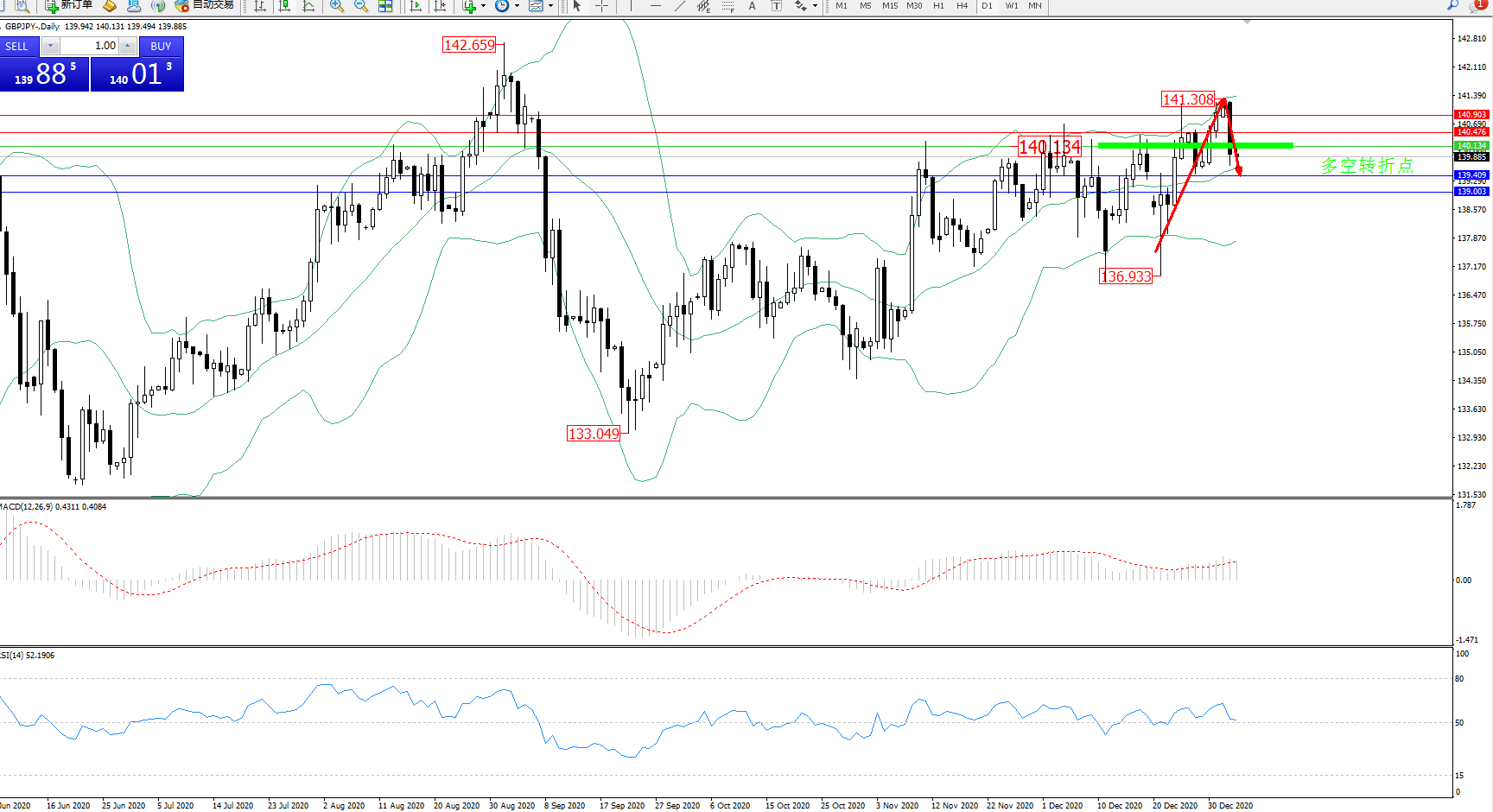 技术点评:多头动力延续布林带指标通道内持续宽幅震荡后持续拉升上扬,纠结于布林带指标中上轨区间高位整理,抵达141.308位置节点后出现快速回撤,触及布林带指标中轨附近节点后开始震荡,布林带指标呈张口走势后有收口迹象,MACD指标处于0轴线上方持续窄幅整理中,RSI指标处于50均衡线上方维持震荡后出现回撤向下移动;