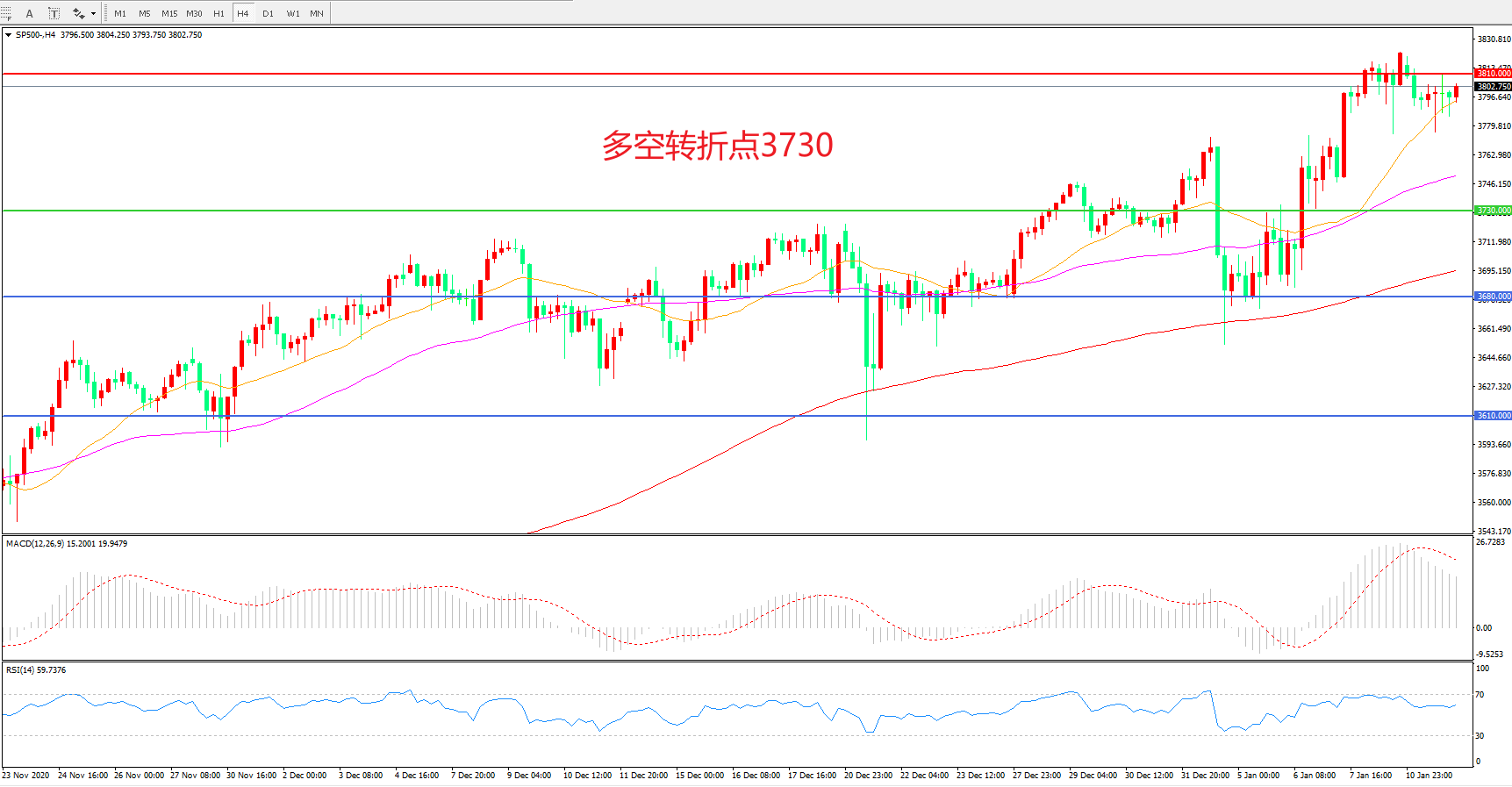 4小时图看,标普500延续高位震荡,短期涨势暂缓,3810成为短期阻力,但均线系统依然呈多头排列,MACD红柱减少,RSI指标走平,日内延续震荡概率较大。