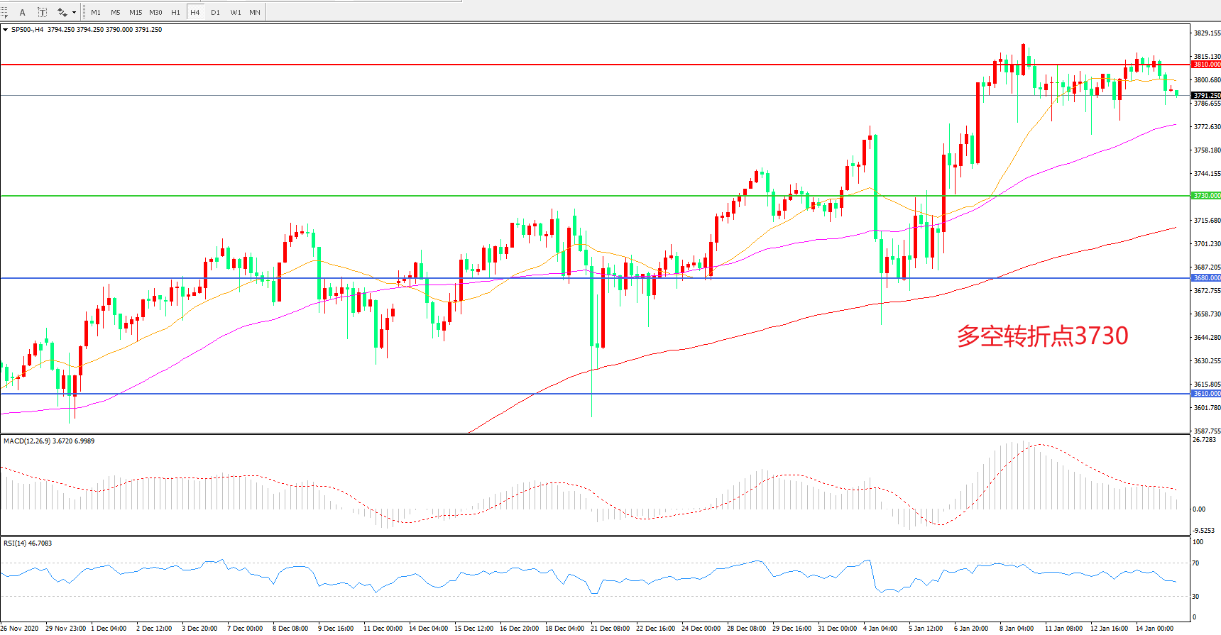 4小时图看,标普500延续高位震荡,短期涨势暂缓,3810成为短期阻力,但均线系统依然呈多头排列,MACD红柱减少,RSI指标走平,日内延续震荡概率较大。