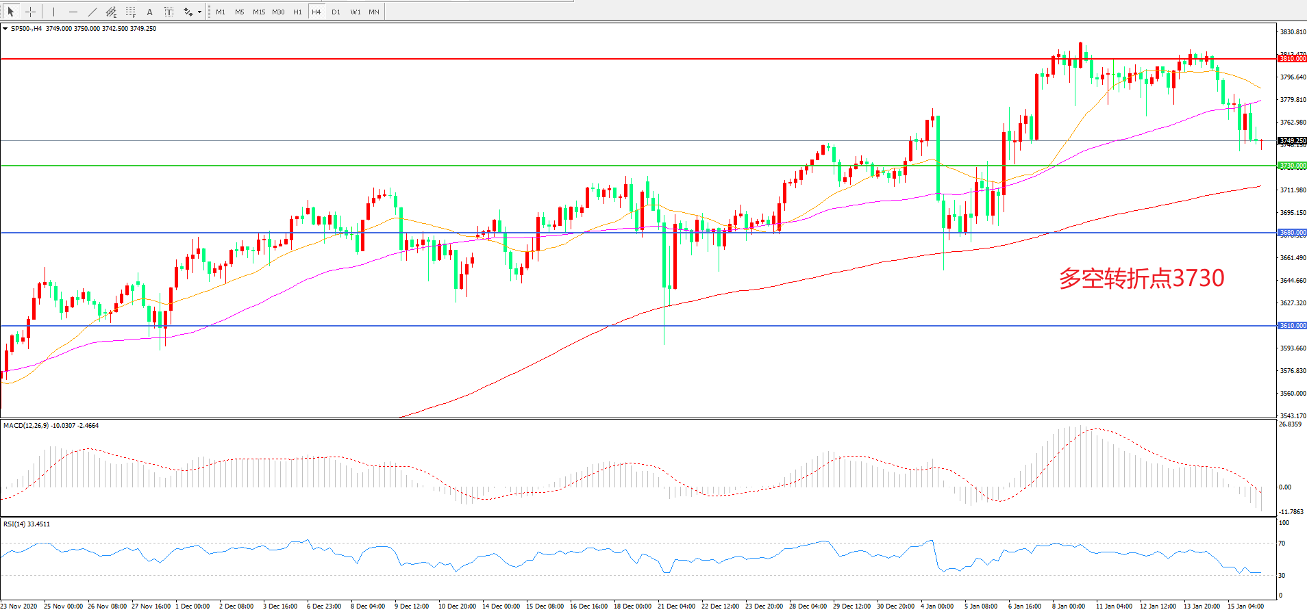周五(1月15日),刺激计划利好被市场快速消化,有“恐怖数据”之称的美国零售销售数据表现惨淡,市场风险情绪回落,标普500震荡下行,收报3750.00点,周先跌幅创11月初以来最大。大型科技股中仅涨超2%的Facebook收涨,苹果跌超1%,奈飞跌近0.6%。