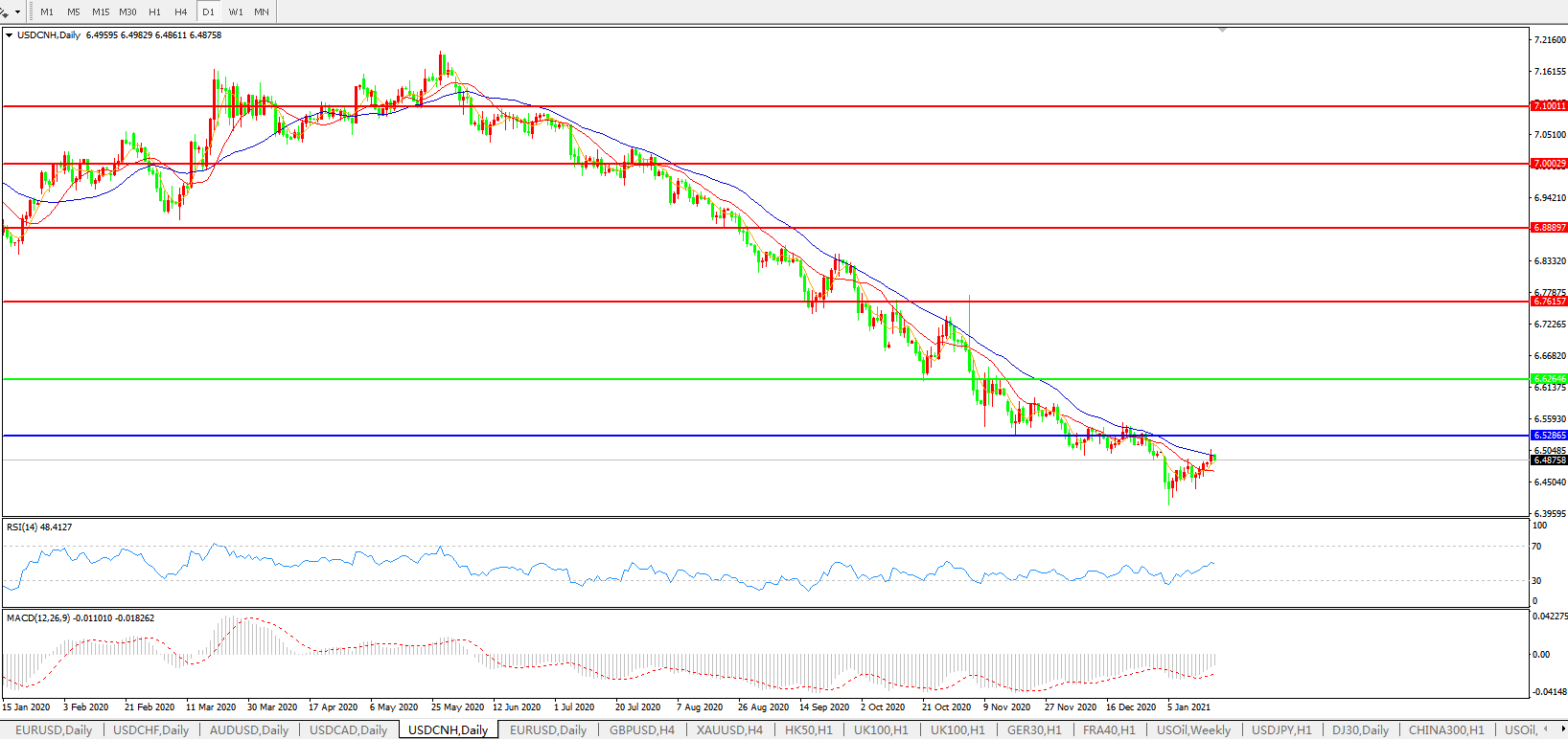 备选策略: 在6.6265之上,看涨,目标价位为6.7615,然后为6.8889。